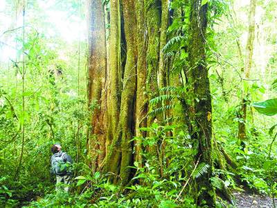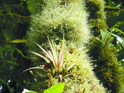 几乎所有的树身上都长着厚厚的、茸茸的苔藓,像大猩猩的肢体。有阳光的时候,仔细看看那苔藓,缀满细细的水珠,亮闪闪,水灵灵。一棵树身上可以长出十来种植物:藤、苔藓、蕨类植物,有的寄生植物叶大茎长,像芋头的茎叶,有的一丛丛像菠萝顶上的叶片。我猜那树干既是水库,又是肥料仓。