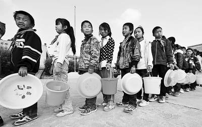 这是云南省陆良县小百户镇罗贡村小学的学生在排队等待取水。这些水是学校从四五公里外用车运来的(2月21日摄)。