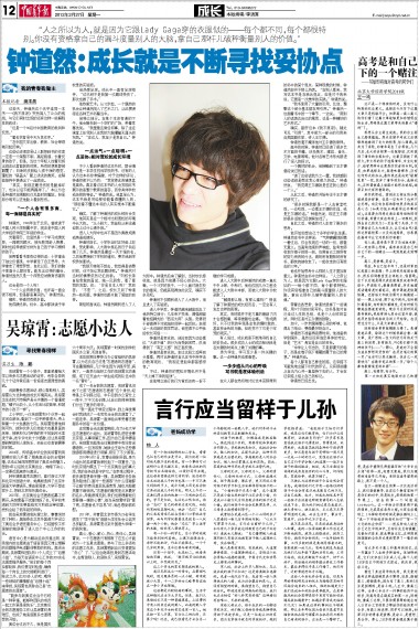 他特立独行。在某个本该有课的下午,他会骑车到一个空旷的广场,带着耳塞发呆。“我愿意去做任何事,除了坐在课堂上任凭别人往我的大脑灌输无厘头的东西。”“在这儿,我至少是我自己。”钟道然说。