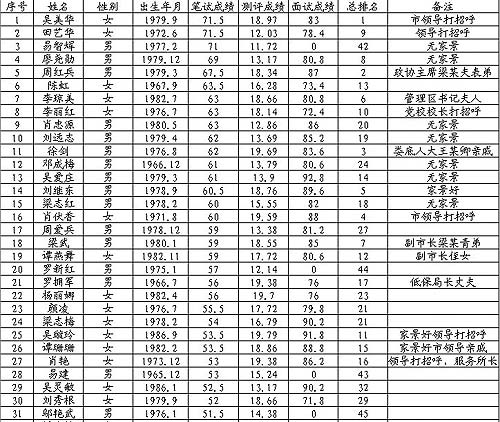 近日,一篇出现在天涯社区上的帖子让湖南省涟源市的一项人事工作备受关注:帖子所附的图表,显示了该市经济开发区公开选调的考生名单及成绩。引人注目的是,图表“备注”一栏中,一些获得选调资格的考生对应有“市领导打招呼”、“副市长侄女”、“家景(境)好”等条目。发帖人称,这些人获得了特殊照顾,该帖也引发了热议。