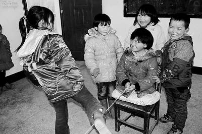 2月23日,江西省德兴市黄柏尚河小学,无腿女孩蒋张子怡在课余时间开心地和同学们一起玩跳绳、剪刀锤子布等游戏。