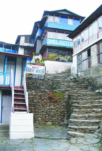 离开巴德岗后,地势开始逐渐上升,沿途风光从青翠的稻田变成郁郁葱葱的针叶林,坐在车顶视野开阔,看着远处变换的风景,呼吸山谷里清凉的空气,不由神清气爽。我们住在山村深处的一家旅馆,旅馆所在地势有利,正好向外探出,视野相对更宽阔,站在旅馆小阳台上,环顾四周,几乎可以看到全景雪山、全景森林,还有村子散落在一个个山头上。因为天气不是很好,有些薄雾,日落和日出都比较朦胧,但远山的景色倒犹如中国的水墨山水画一般恬淡,山谷、村庄在烟雾中忽隐忽现,仿佛一个神秘的世界缓缓向我们走来,慢慢揭开面纱。