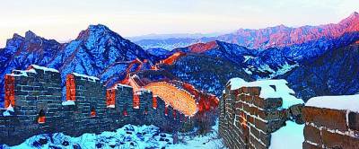 早晨6点,收拾装备我们开始登城。气温低得呼吸时鼻腔发黏,背着重负,我感觉有些吃力。一批南方影人和一个英国小伙儿很快在途中超过了我们,我被落在最后慢慢跋涉,老公为等我不敢走得太快。终于登上城墙时,发现刚才超过我们的几个人,因行走速度太快,体力透支而无法走到拍摄地点,寒冬的早晨,我们上演了龟兔赛跑的故事。我们慢慢匀速向熟悉的机位前进。东边天上的乌云开始变红,边墙也被映红,此时那位英国小伙儿也赶到位置,寒风中我们共同享受着长城日出的壮美景色。
