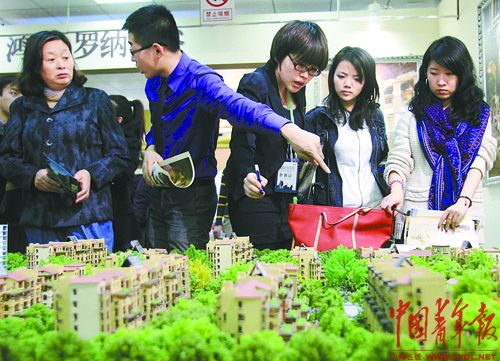 4月5日,北京春季房展会上,购房者正在销售人员的引导下查看楼盘。