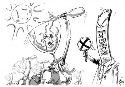 网民“张宏杰”4月3日晚发布一张图片,画面中是一组河南省商丘市宁陵县政府机构的牌子,其中一块牌子写着——“宁陵县禁止午间饮酒办公室”,此事引来上万次转发和评论,成为近几天的网络热点事件。(《南方日报》4月5日)