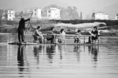清明小长假第一天,江西婺源便迎来客流高峰。许多家庭趁着这个春花烂漫的时节前去踏青。图为婺源月亮湖上坐竹筏的游人。
