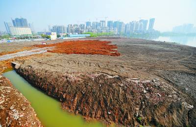 填湖的新土还裸露在沙湖边,又一片湖面消失了(4月7日摄)。