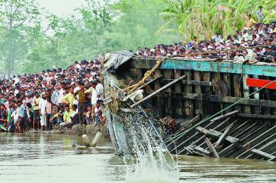 5月1日,在印度东北部阿萨姆邦,人们将一艘沉船的部分残骸拖到岸边。印度警方4月30日称,印东北部阿萨姆邦当天发生的沉船事故已经确认造成105人丧生,目前仍有大约100人下落不明。