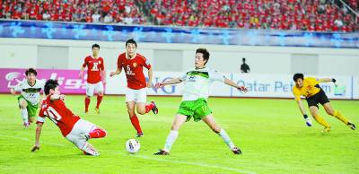 5月1日,在亚冠联赛小组赛中,主场作战的广州恒大队在终场前连丢两球,以1∶3不敌韩国全北现代队,出线形势严峻。图为全北队球员射门。
