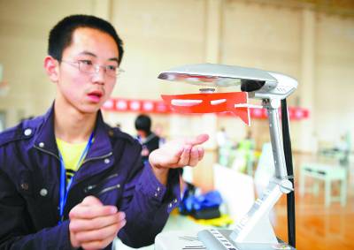 近日,陕西省第27届青少年科技创新大赛在高新一中举行。图为一名学生在观察磁悬浮演示仪。