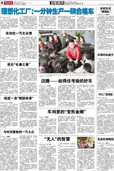 走出一汽大众的车间,其高度的自动化程度给我留下了极其深刻的印象。那摇头晃脑、手舞足蹈地“变形金刚”们,似乎还在礼貌地向我不舍地道别,他们整日不停歇地忙碌着,是一汽大众最勤劳的员工。