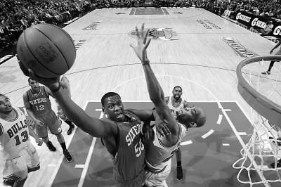 5月2日,NBA季后赛次轮,公牛与76人队球员在篮下对抗。