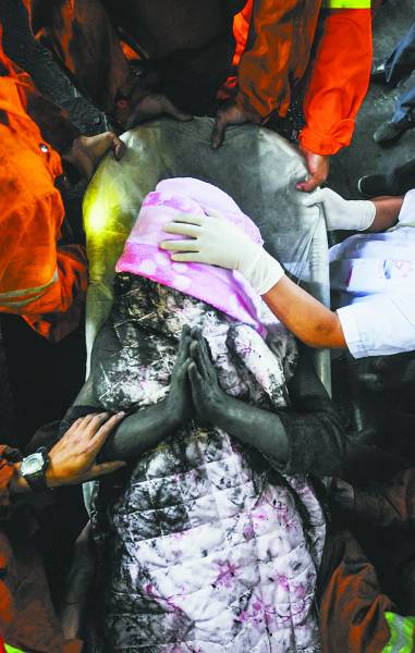 7月8日,一名获救矿工躺在担架上双手合十表示感谢之情。