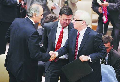 7月19日,在位于纽约的联合国总部,俄罗斯和中国否决英国等国提交的叙利亚问题决议草案而使之未获通过后,叙利亚常驻联合国代表贾法里(前左)与俄罗斯常驻联合国代表丘尔金握手致意。