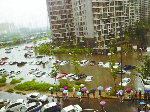 7月21日,北京遭遇强降雨,立水桥南,居民小区的车辆被淹。王长胜/CFP |