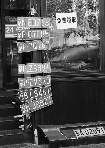 7月21日北京下暴雨时,一些汽车的车牌在涉水行进时被冲刷脱落。图为7月22日,北京一家餐厅门口的免费招领车牌处。