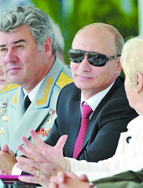 俄罗斯总统普京(中)11日在莫斯科郊外的茹科夫斯基市出席俄空军建军100周年航空展,并在演讲中强调,俄空军要提高战斗力,增强应对各种复杂任务的能力。