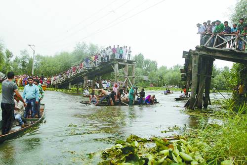 8月11日,在印控克什米尔首府斯利那加,当地居民和救援人员在桥梁坍塌现场搜救幸存者。当日,斯利那加民众举行示威游行,要求当地政府修建道路。游行人群行经达尔湖时,一座木制桥梁发生坍塌,造成至少30人受伤。