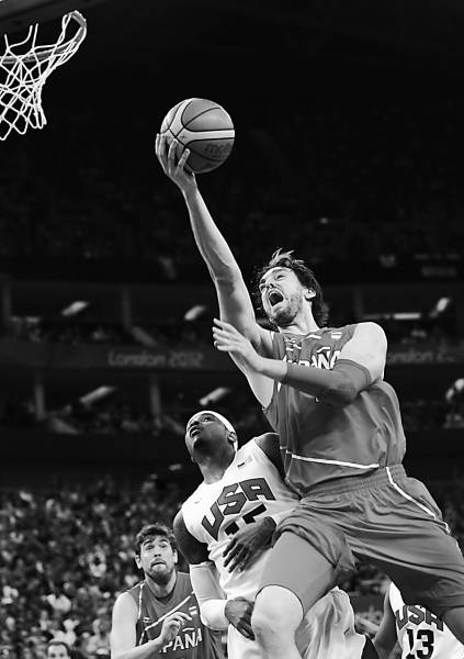 8月12日,美国男篮以107∶100战胜西班牙队,夺得伦敦奥运会男篮冠军。图为西班牙球员保罗·加索尔(右)在比赛中上篮。