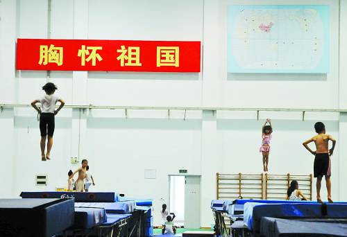 8月10日,福建福州市体育运动学校蹦床队的小队员们进行蹦床动作训练。在福州市体育运动学校蹦床馆,一批十几岁、甚至才几岁的小队员怀揣着自己的奥运梦想,在训练场内挥洒汗水,刻苦训练,不断追逐更高的竞技目标。
