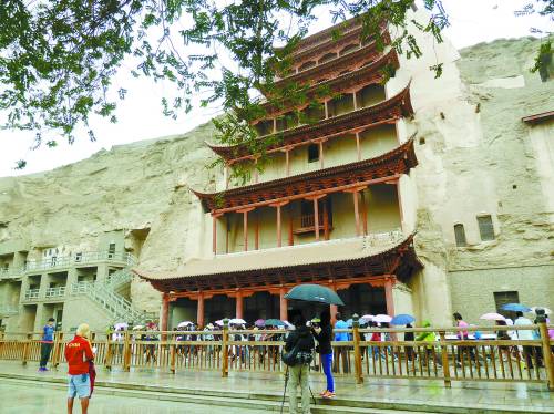 8月5日,甘肃敦煌小到中雨,游客冒雨参观莫高窟。来自敦煌研究院的数据显示,40个人进入洞窟参观半小时,洞窟内空气中的二氧化碳就会升高5倍,空气相对湿度上升10%,温度升高4摄氏度。为降低湿气对洞窟的影响,莫高窟根据每个洞窟不同的情况,轮流开放,对洞窟的温度、湿度进行实时监测,一超标立刻关闭。