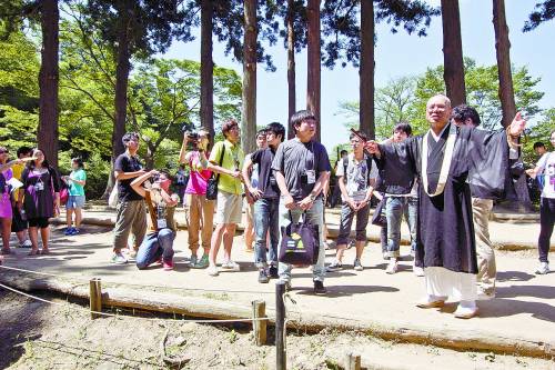在短短五天行程中,教授们带着学生跑过了日本最大国土本州岛的三分之二。所到之地包括东京、越谷以及东北部的岩手县、西部的京都。最高密度的一天,从海港到村庄,从学生社会实践的森林小屋到日本传统神乐展示的会堂,马不停蹄地跑了6个地方,参观、听演讲、实地考察。在如此紧张的行程中,走访佛寺、日本神社多达5处。其实,这是经过教授们慎重考虑的。