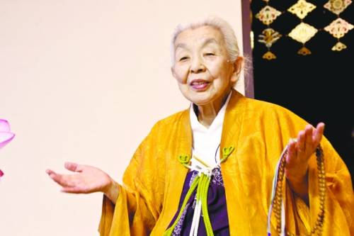 在京都北部的鞍马寺,迎接学生们的,是一支洁白得惊人的莲花。它的背后,站着鞍马寺的女主持信乐香仁,身披金黄锦袍,白发挽成一个发髻。