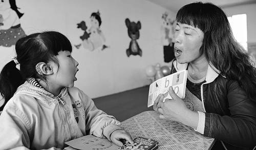 10月12日,张铁莲在纠正一名聋儿发音时的口型。