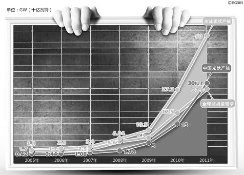 2005~2011年全球光伏产能、装机量需求、中国产能数据对比图。