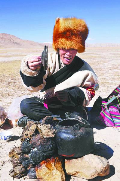 根据不同时节野生动物的生活规律,仁青占堆要不定期在他所负责的近千平方公里的范围内巡护,在路上饿了就捡牛粪生火热茶,以随身带的糌粑、羊肉充饥;有时巡护的地方较远,他就在气温零下10摄氏度左右的草原上搭帐篷过夜。
