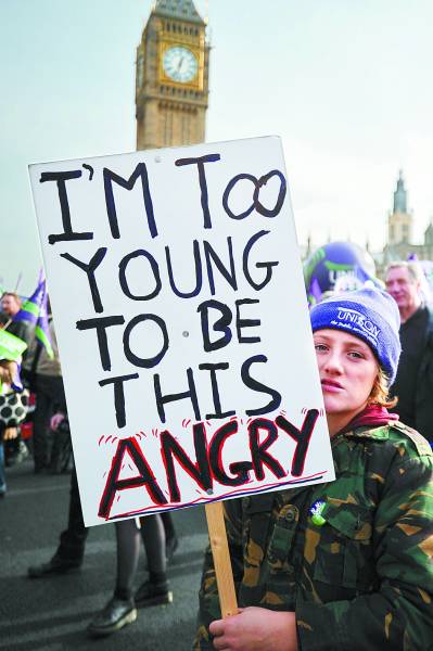一名抗议者10月20日手举标语在英国伦敦参加游行示威。超过10万英国人当天在首都示威,抗议政府推行紧缩政策对精英阶层和富裕群体有利。新华社/法新