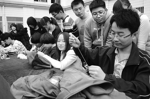 10月28日,大一学生刘俊东(右)在参加缝补比赛。当日,山东聊城大学政治与公共管理学院2012级大一新生举办了“比赛缝补、倡导勤俭”缝补比赛活动,大学生们通过把不合身和破旧的衣服“修补”、“改款”、“美容”,从中既体会了勤俭节约的理念,又培养了动手能力,以此迎接10月31日“世界勤俭日”的到来。