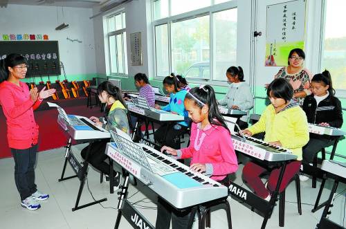 大厂回族自治县北坞村回民小学少年宫的老师在指导孩子们弹电子琴(10月22日摄)。