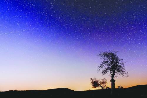 2011年11月28日,匈牙利布达佩斯东北部,俄罗斯“福布斯-土壤”火星探测器的拖尾轨迹(图左)划破星空。11月9日该探测器发射升空后未能按计划变轨前往火星,现正环绕地球上空轨道运行,可能在数周内跌回地球。
