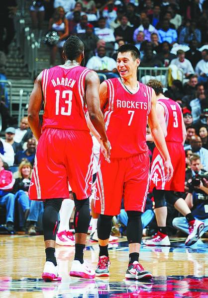 11月3日,NBA常规赛,火箭客场以109∶102击败老鹰,取得两连胜。图为火箭球员林书豪(右)和哈登在比赛中交流。
