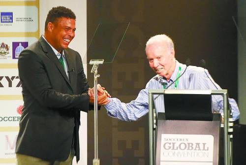 当地时间11月27日,罗纳尔多(左)随团考察2014年巴西世界杯主办城市。
