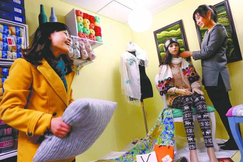11月28日,浙江理工大学染织艺术设计系大四学生李晓平(左一)在布置编织吧。