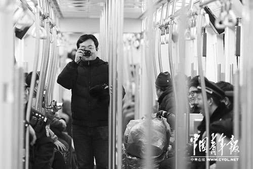 12月30日,北京地铁6号线列车里,一个年轻人正用相机拍照,记录北京地铁新线路的开通。
