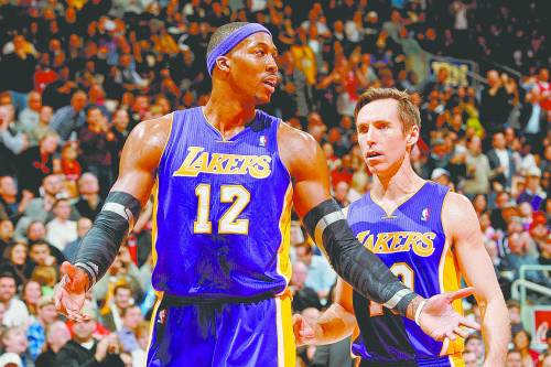 1月21日,湖人队在NBA常规赛中,客场以103∶108不敌猛龙队。图为湖人球星霍华德(左)和纳什在比赛中。