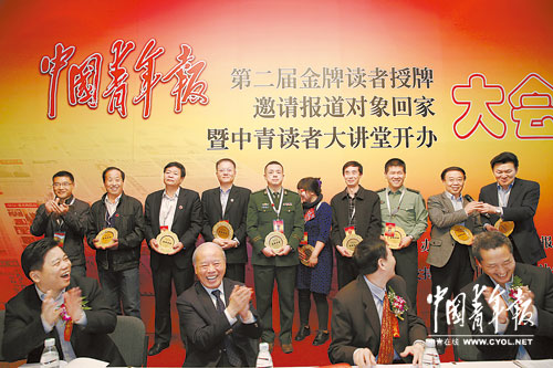 在今天上午的中青报金牌读者(第二届)授牌·邀请报道对象回家暨中青读者大讲堂开班仪式上,10名金牌读者揭晓,并被授予奖牌。这10名金牌读者是从500多名参选读者中层层遴选出来的,50名银牌读者也同时产生。
