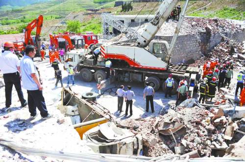 5月20日,救援人员在爆炸现场搜救被埋人员。