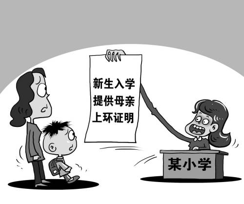 今年5月初,《南方都市报》报道称,广东省佛山市一名卢姓男子拿着孩子的小学报名申请表,到社区居委会盖章时被要求先提供妻子的上环证明。因他的妻子未上环,孩子求学之路一度受阻。