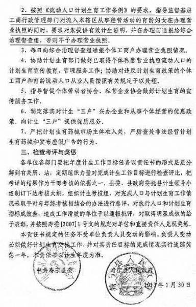 寿宁县工商局负责人解释说,工商部门虽然是垂直管理,但同样要接受当地政府的领导。计划生育是基本国策,也是老大难问题。作为寿宁县计划生育领导小组齐抓共管的成员单位之一,我们按县委县政府的要求,协助做好计划生育工作,同时“要把年度计生工作目标任务以责任书的形式层层分解到有关所、站,定期组织力量对完成计生工作目标进行检查评比,把考评的结果作为干部考核的依据之一”。
