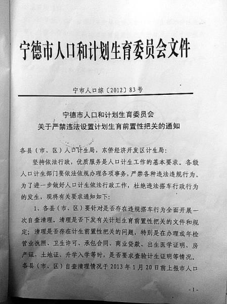 2012年12月31日,宁德市人口和计划生育委员会发出的《关于严禁违法设置计划生育前置性把关的通知》要求,“各级人口计生部门要严格按照人口和计划生育法律法规办事,严禁不符合规定的计划生育前置性把关的行为。”“各县(市、区)要针对是否存在违规搭车行为全面开展一次自查清理。清理是否下发有关计划生育前置性把关的文件和规定;清理是否存在计生前置性把关的问题,特别是在办理或年检营业执照、卫生许可、承包合同、商业贷款、出生医学证明、房产证、土地证、升学入学等时,是否要求查验计生证明等情况。各县(市、区)自查清理情况于2013年1月20日前上报市人口计生委法制科。”