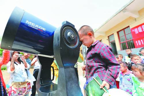 5月27日,河南省林州市桂林镇兴泉村水法小学,一名留守儿童通过天文望远镜观测太阳黑子,观看绚丽多彩的太空世界。