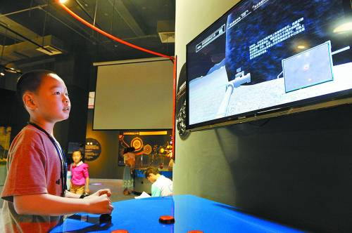 5月24日,一名参观者通过游戏的方式体验月球资源的开发和利用。