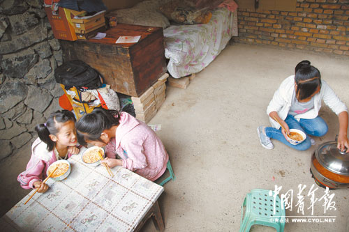 5月29日,10岁的董美艳、12岁的董飞艳以及14岁的董小艳(从左至右)三姐妹正在吃午饭。
