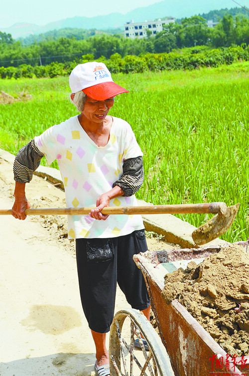 黄榕娥推着双轮小车,满载砖头、泥土,经过村前的路。她用一顶帽子遮挡烈日,也遮住自己全白的头发。