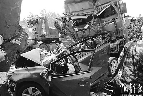 网友“小思绪”今日6时39分在现场发帖称:“就刚才楼主在去郑州的路上,一大货车撞上小汽车,导致后面好几辆大货车连环追尾。还好我开得慢。现正在围观周边村民抢东西。”