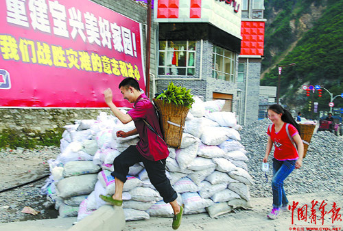 5月25日,四川雅安宝兴中学高三一班的刘东燚(左)和即将中考的妹妹刘敏一起去给县城里的伯伯家送些自家地里种的菜。之后,他就得赶回学校准备高考。他家住在附近的雪山村,地震时家里房子被滚落的山石砸塌了,这是他震后第一次放假回家去看母亲。